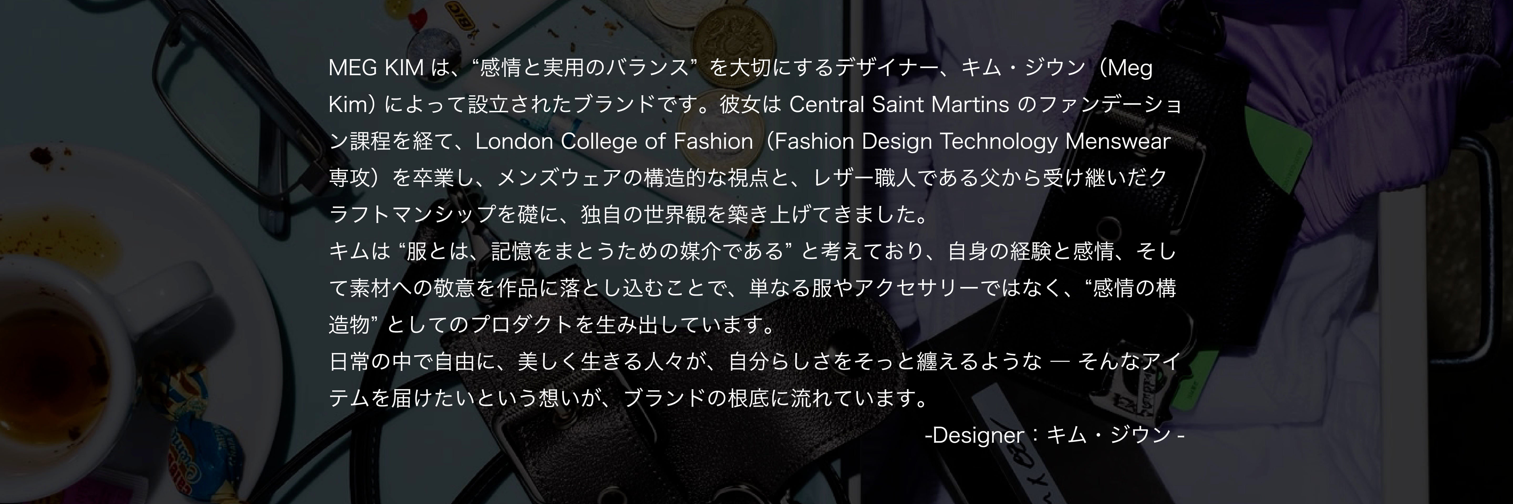 Central Saint Martinsのファンデーション課程を経て、2022年に自身の名を冠したブランド「MEG KIM」を設立。ブランド設立後は、ソウル・ 東京・上海・ロンドン・ニューヨークなど主要都市のセレクトショップへと展開が広がり、ブランドとして次の段階へと歩みを進めています。